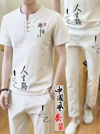 夏季棉麻套装男亚麻短袖t恤潮流休闲半袖唐装汉服中国风男装衣服v